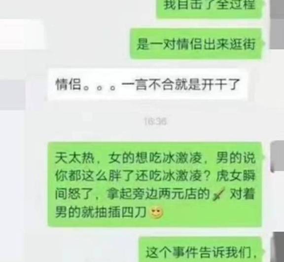 按照目击者的说法,事发原因仅仅是因为一个冰淇淋引起的,但是真实原因尚无法判断。现警方已将嫌疑人王某抓获归案,不过受害人张某经抢救无效死亡,案件正在进一步侦办中。虽然张某调侃王某是张某的不对,但是王某也不应该捅死自己的男友啊。你对这件事情怎么看?看了这件事情你还敢随意调侃别人吗?