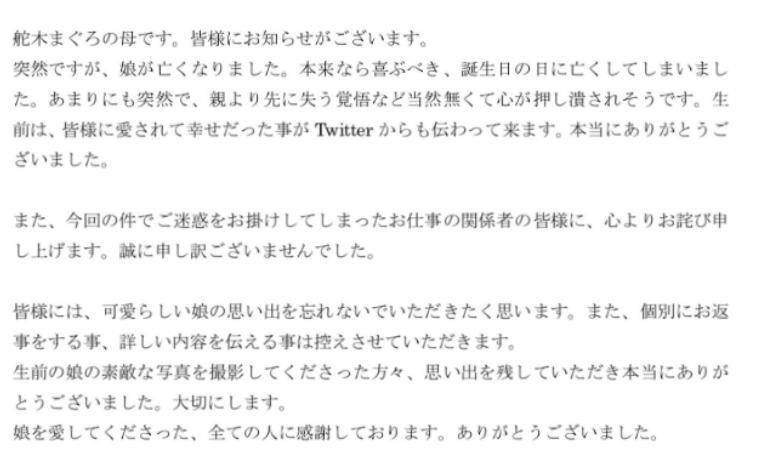 舵木鲔的母亲发出讣告透露死讯,悲痛表示女儿突然去世了,本来应该高兴的,因为那天是她的生日,太突然了根本来不及准备,感谢大家对舵木鲔的喜爱,对于公开死讯带来的不便表达由衷的歉意,希望你们可以记住可爱的舵木鲔。