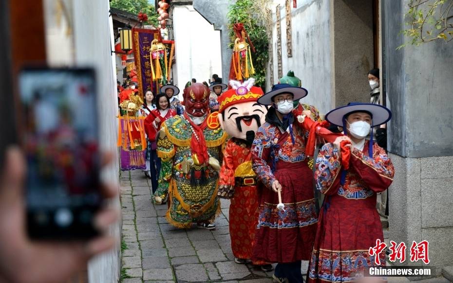 正月初五,中国民间素有迎财神的习俗,福州三坊七巷天后宫举行“迎财神”民俗巡游活动,吸引许多人驻足观看。吕明 摄