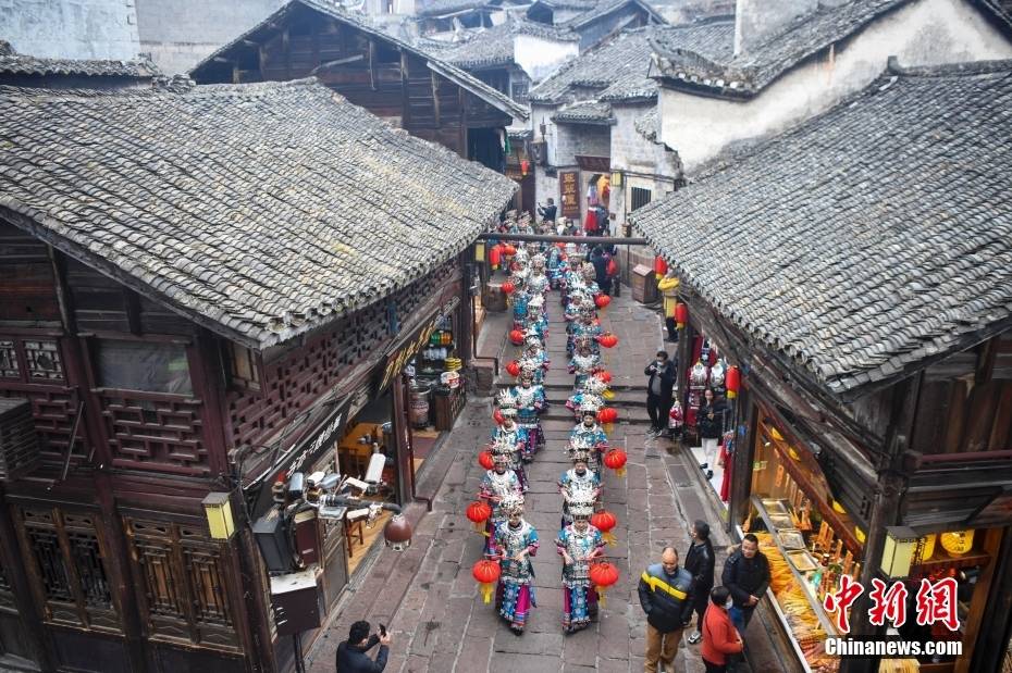 正月初一,湖南湘西凤凰古城的苗家人身着苗族盛装,打着苗鼓、提着灯笼穿梭在古城的大街小巷,庆祝新春佳节的到来。杨华峰 摄
