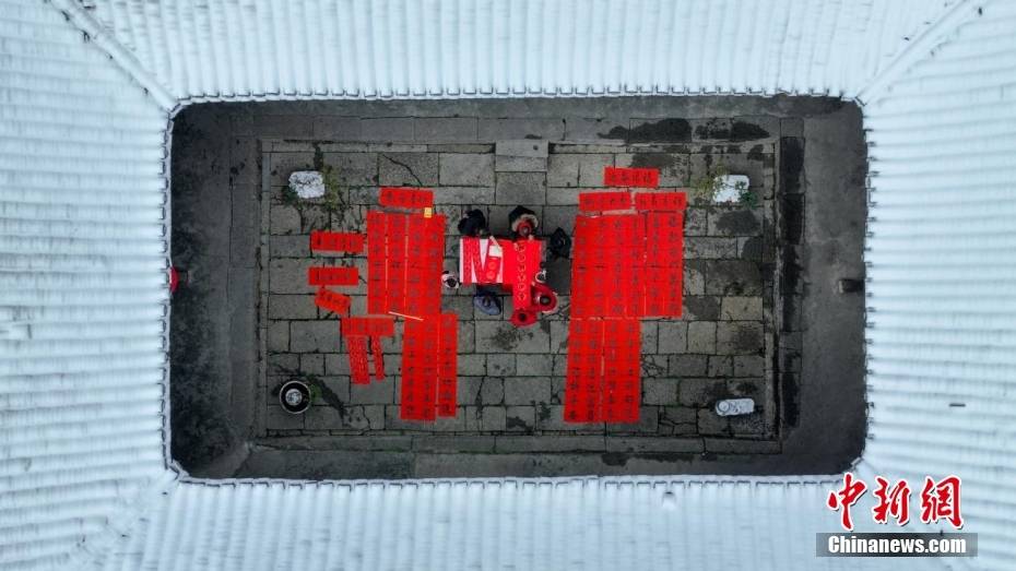重庆酉阳洞子坨传统村落,当地书法家在白雪覆盖的四合院里为村民书写春联,村民们挂灯笼、贴春联、推豆腐、打糍粑,在欢乐喜庆中迎接新春佳节的到来。邱洪斌 摄