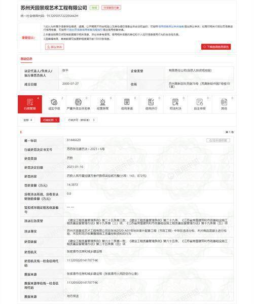 1月16日, 张家港市住房和城乡建设局作出苏苏张住建罚决﹝2023﹞6号处罚决定书,信用中国(江苏苏州)官网载明:苏州天园景观艺术工程有限公司在张地2020-A01号地块室外配套工程(市政工程)中存在违法分包、未对商品混凝土进行检验、未及时同步收集整理施工质量控制资料的行为,依据《建设工程质量管理条例》第六十二条第一款、《建设工程质量管理条例》第六十五条、《江苏省房屋建筑和市政基础设施工程质量监督管理办法》第二十五条第(四)项,处罚款14.3872万元整。