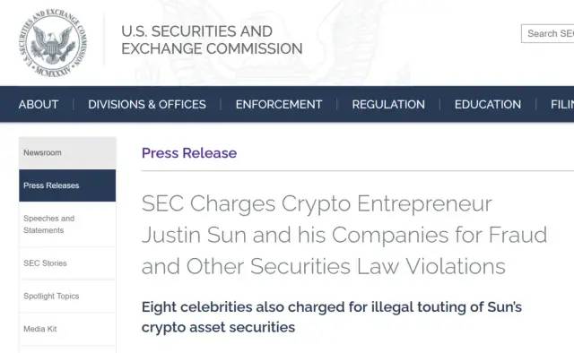 SEC在声明中说,孙宇晨策划了一场名人促销活动,诱使投资者购买TRX和BTT代币,并隐瞒了名人通过推文获得报酬的事实。