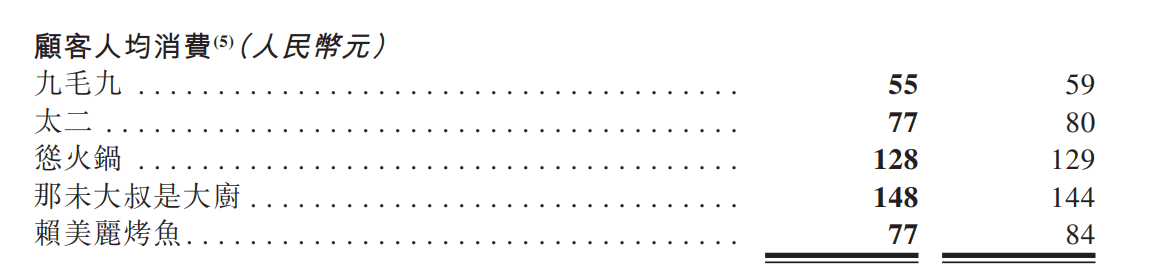 第三,在人均消费上,2022年九毛九西北菜、太二酸菜鱼的客单价分别为55元、77元,同比减少4元、3元,而怂火锅客单价达128元,同比保持稳定(2021年为129元)。