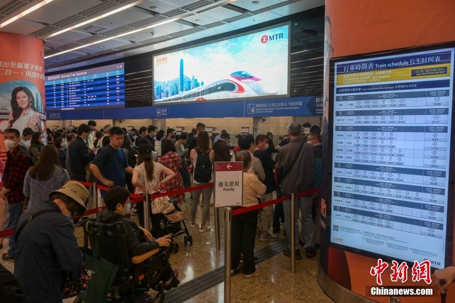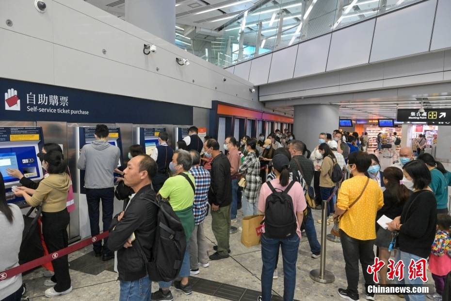 香港西九龙高铁站自助购票机前大排长龙。中新社记者 陈永诺 摄
