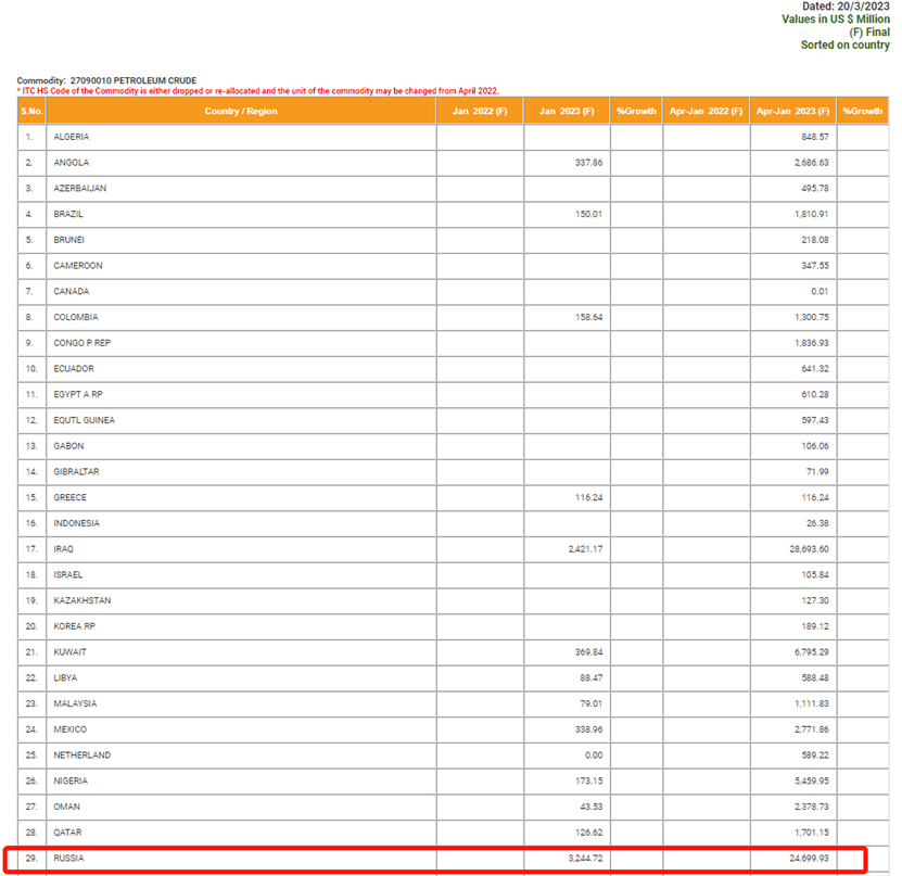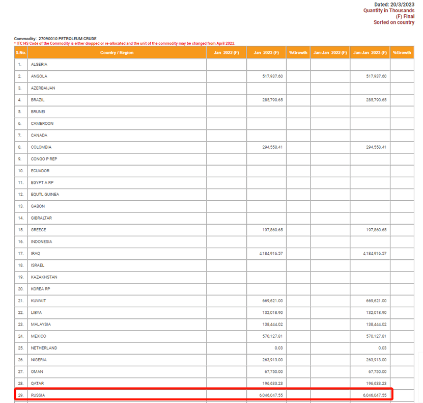 今年2月,路透社报道称,印度在1月日均进口的俄罗斯原油数量达到了创纪录的140万桶。根据印度商务部网站公布的最新贸易数据,今年1月,印度从俄罗斯进口的原油总量为6046047.55吨,价值32.4472亿美元。