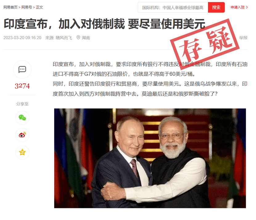 3月20日前后,中文网络流传说法称,印度宣布加入西方国家对俄罗斯的制裁,要求所有银行不得违反对俄金融制裁,所有石油进口价格不得高于七国集团对俄罗斯的石油限价。