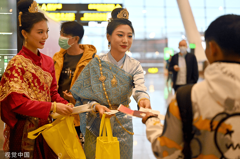 2023年2月6日,南宁,工作人员身着泰式服装为首批赴泰旅客赠送纪念品。人民视觉 资料图