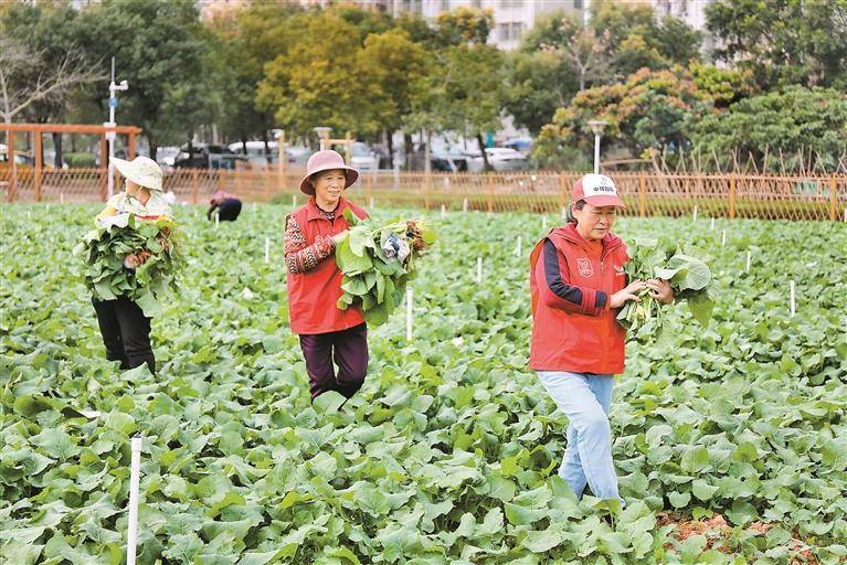 位于光明区新湖街道圳美社区的幸福菜园,传来阵阵欢笑声,既热闹又和乐融融。二十余名身穿红马甲的志愿者,在这里松土除草、浇水施肥,采下来的蔬菜分袋装好再由志愿者上门送给楼村、圳美、新羌社区的困难群体。