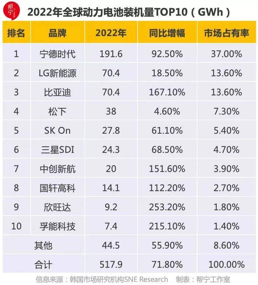 财报显示,2022年实现营业收入3285.94亿元,同比增长152.07%;归母净利润307.29亿元,同比增长92.89%。装机量上来看,2022年动力电池系统装机量为191.6GWh,同比增长92.5%,并且市场占有率为37.0%,较上年同期提升4个百分点。