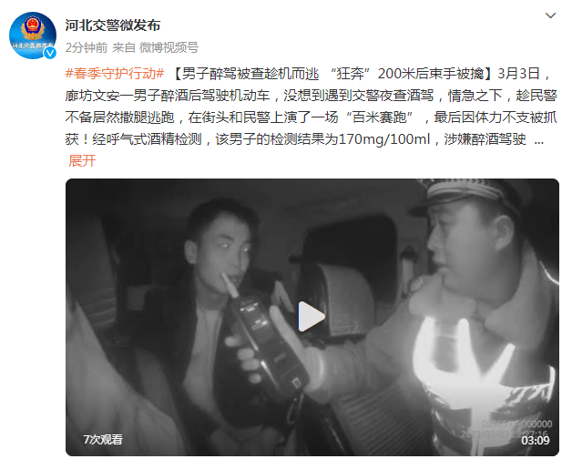 原标题:男子醉驾被查趁机而逃,“狂奔”200米后束手被擒