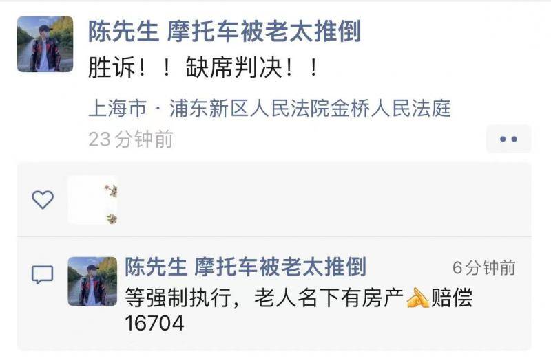3月24日,该案在上海浦东新区人民法院开庭。陈先生告诉北青报记者,他没有请律师,自己和家人、朋友参加了庭审,但被告人无一人到场,也没有代理律师。他表示,从事发至今9个月,推车老人及其家属都是这种不配合处理的态度,正是这样的态度让他更坚定了维权到底的决心。“庭审还是比较顺利的,法院支持了我的诉讼请求,判决被告赔偿我修车款16704元并承担诉讼费。对这个结果我是比较满意的,接下来就是执行需要时间。”