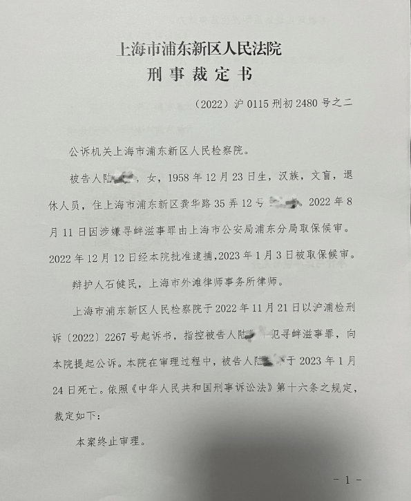 1月24日,老人去世。此前检察机关曾以陆某某涉嫌寻衅滋事罪向法院提起公诉,但由于老人死亡,依法裁定本案终止审理。