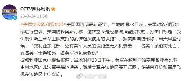 美国国防部最新证实,当地时间3月23日晚,美军对叙利亚东部进行空袭。美国防长奥斯汀称,这次空袭是经美国总统拜登授权的,打击目标是“受伊朗伊斯兰革命卫队支持的武装组织使用的设施”。据美国国防部称,当天早些时候,“叙利亚东北部一处有美军人员的设施遭无人机袭击,一名美军承包商死亡,五名美军士兵和另一名美军承包商受伤”。