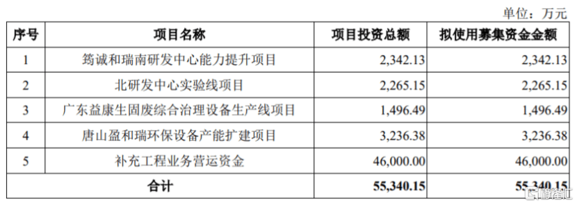 本次申请上市,筠诚和瑞拟募集资金约5.53亿元,用于筠诚和瑞南研发中心能力提升项目、北研发中心实验线项目、广东益康生固废综合治理设备生产线项目、唐山盈和瑞环保设备产能扩建项目、补充工程业务营运资金。