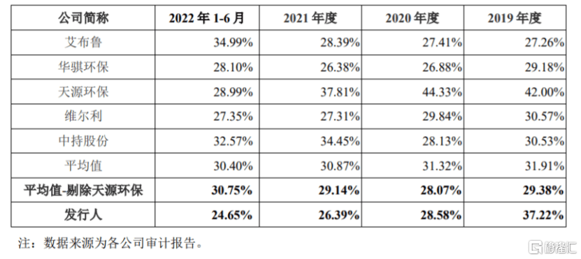 2020年至2022年上半年,公司的主营业务毛利率低于同行业公司平均值,主要系业务结构不同所致。其中,同行公司天源环保运营服务收入占比较高,毛利率水平较高,如果剔除天源环保影响,筠诚和瑞的毛利率水平与同行业平均水平相对接近。