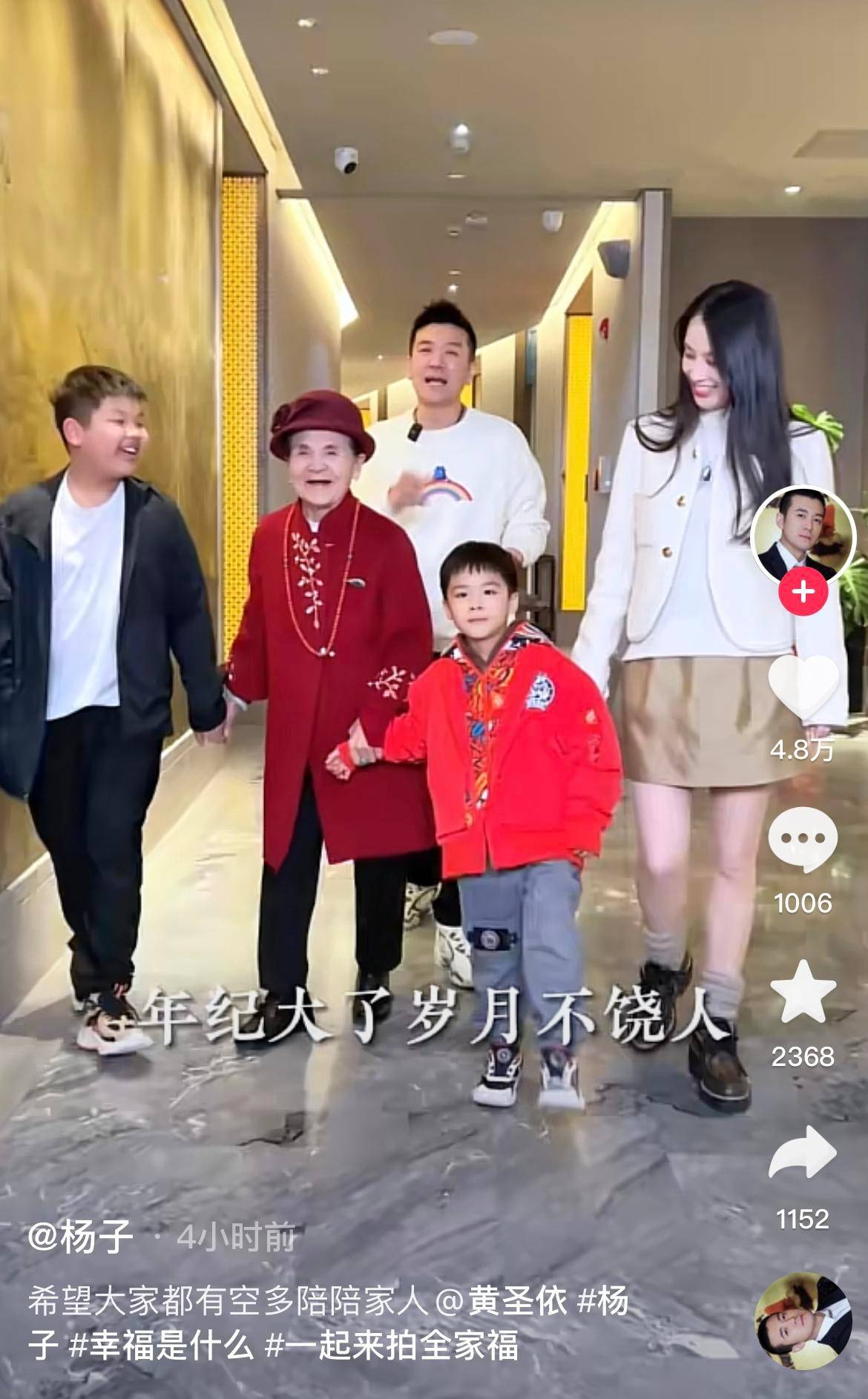 视频中,杨子黄圣依的两个儿子安迪和安麟,在爸爸的安排下和90多岁的奶奶见面吃饭。老人家一手牵着一个孙子,杨子黄圣依陪伴在侧,画面温馨。