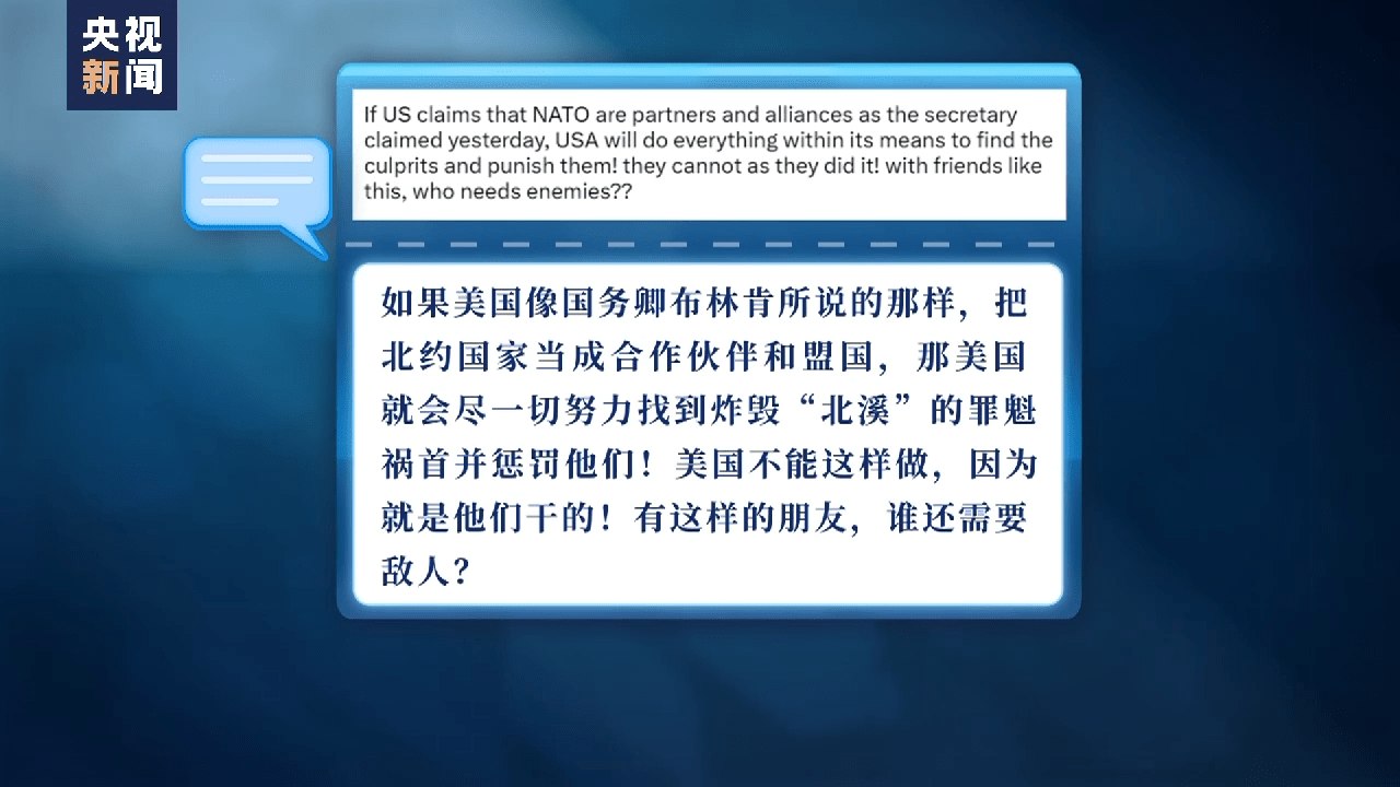 “如果美国像国务卿布林肯所说的那样,把北约国家当成合作伙伴和盟国,那美国就会尽一切努力找到炸毁‘北溪’的罪魁祸首并惩罚他们!美国不能这样做,因为就是他们干的!有这样的朋友,谁还需要敌人?”