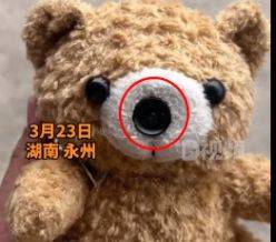 湖南永州一名20岁女生小何日前给侄女玩具熊时发现异常。原本普通的玩具熊不断冒红光,小何决定拆开查看,结果惊讶地发现里面装有微型摄像头。