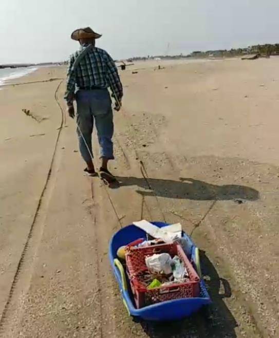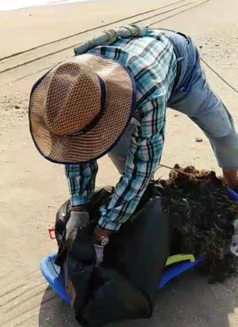 这样的场景让汪敏江心疼,他决定开始捡垃圾。一公里的海岸线,大约3万平米的沙滩,成了他的主战场。
