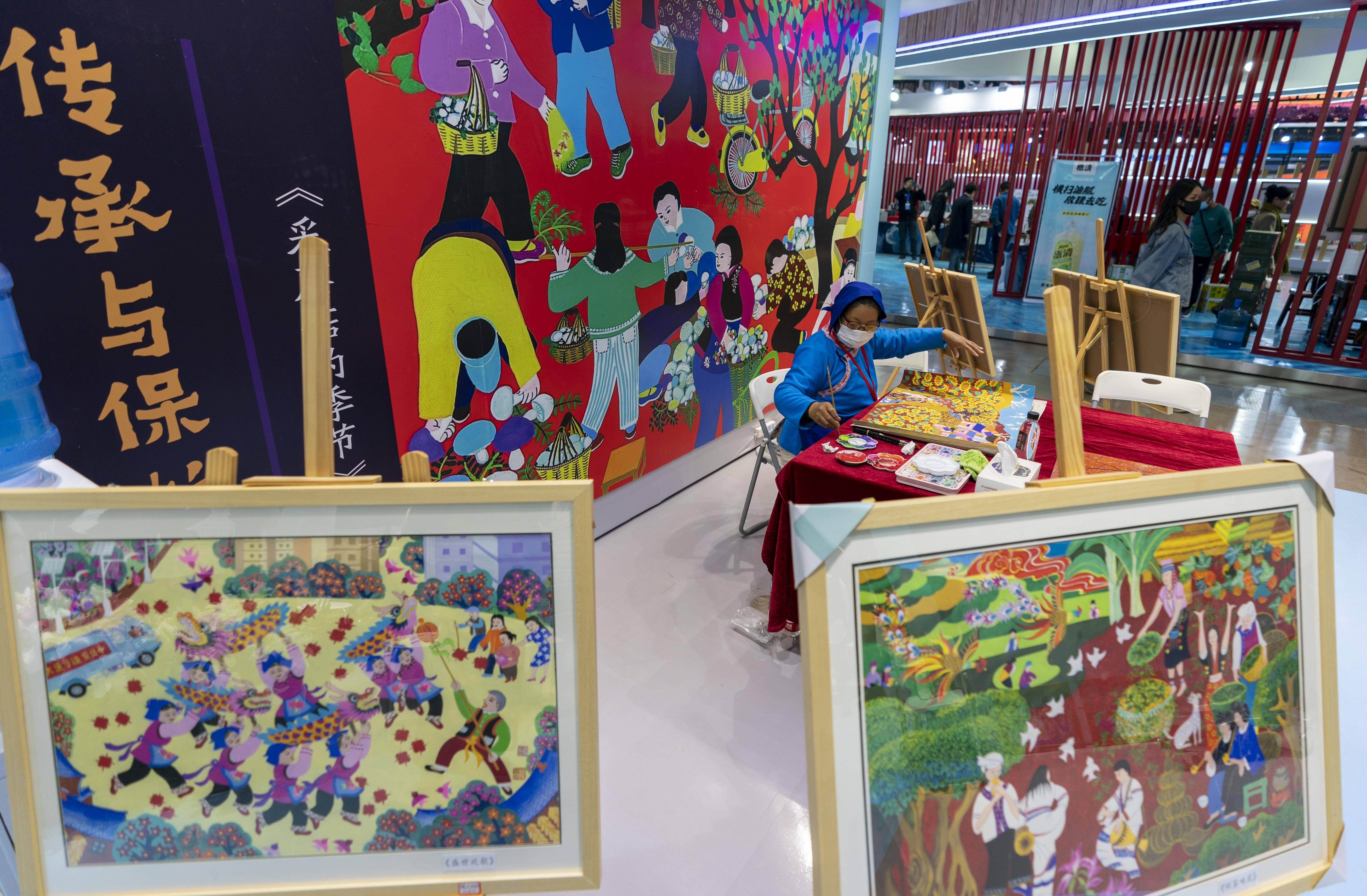 3月24日,农民画家刘琼丽带着自己的作品在首届云南昆明(国际)版权博览会上。 新华社记者 陈欣波 摄