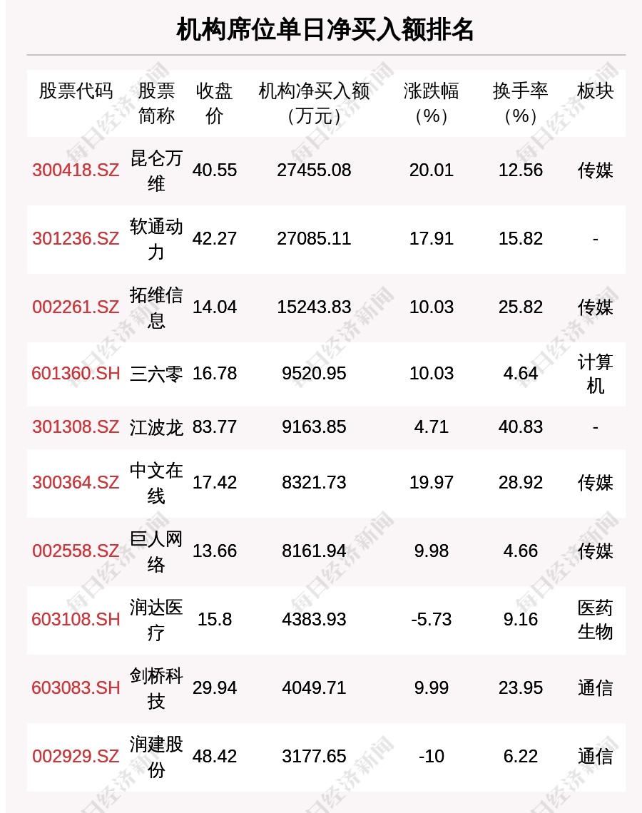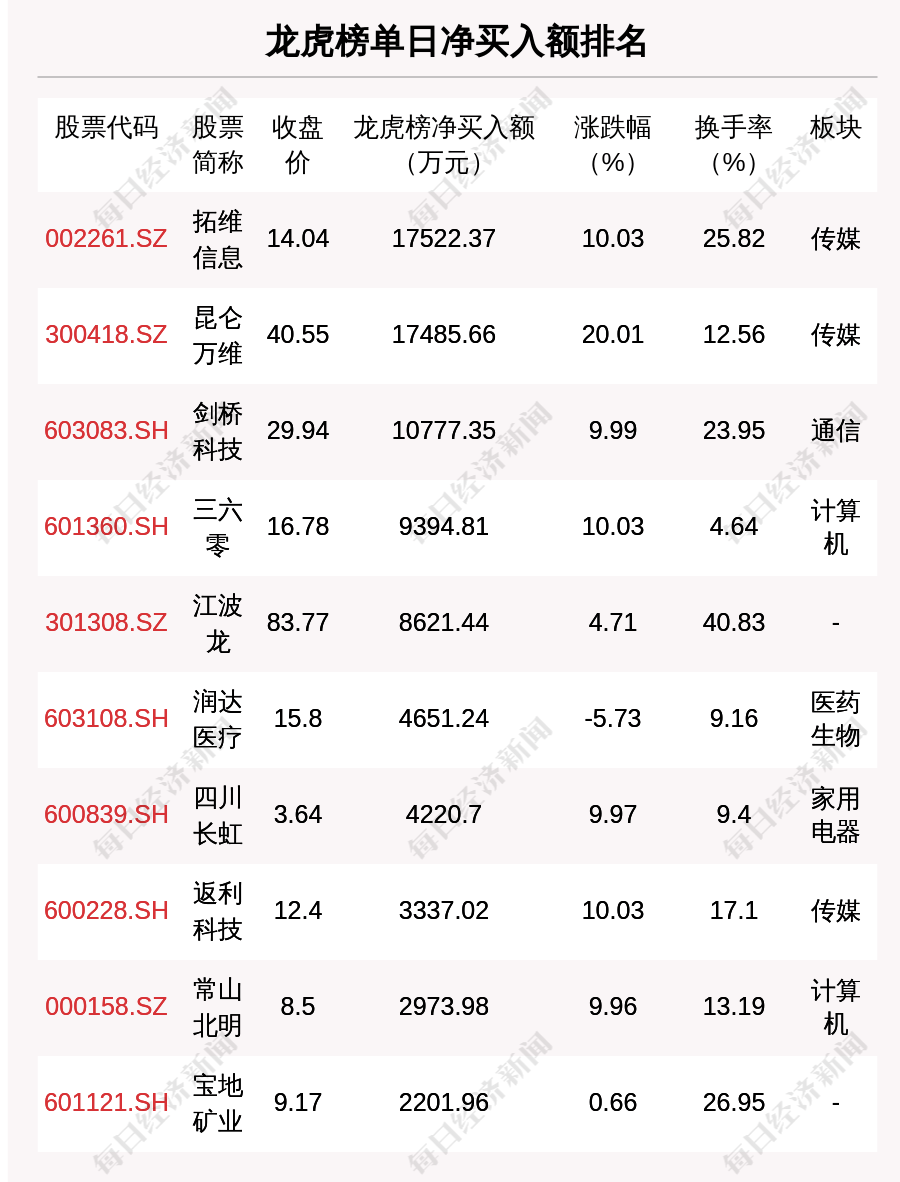 在龙虎榜中,涉及机构专用席位的个股有26只,净买入额前三的是昆仑万维、软通动力、拓维信息,分别为2.75亿元、2.71亿元、1.52亿元。