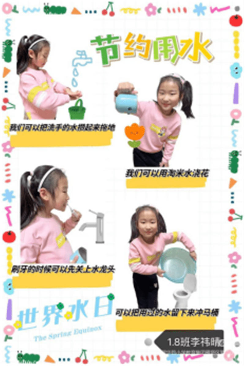 同学们还通过照片的方式,分享自己的节水小妙招,以自身带动身边的每一位亲人、朋友,让身边的每一个人都意识到世界淡水资源的稀缺,体会到珍爱水资源的重要性,真正成为节约用水的宣传者、践行者。