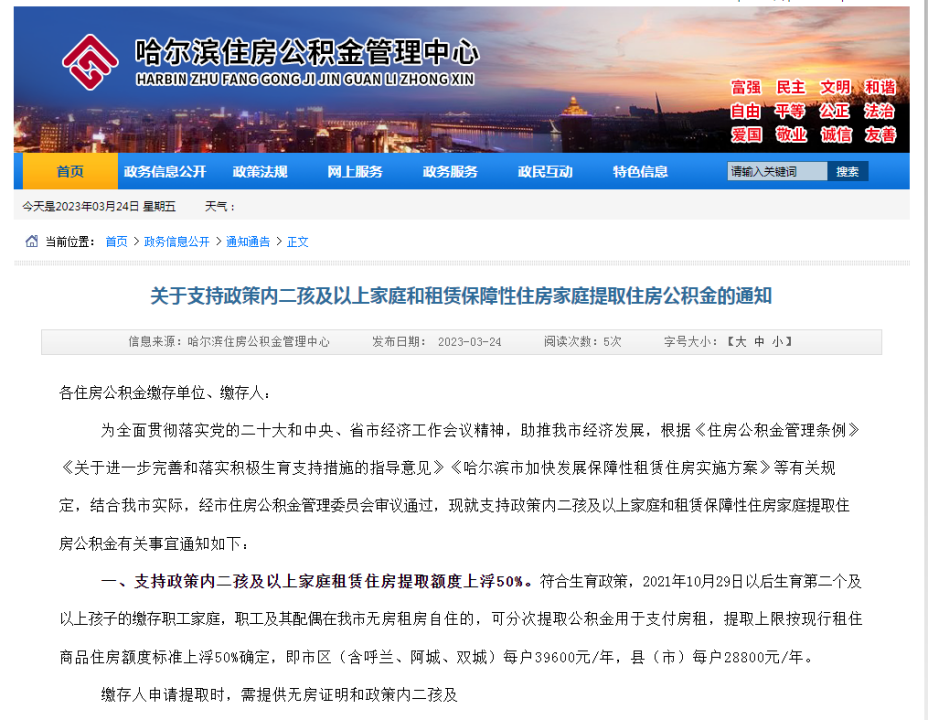 3月24日,哈尔滨住房公积金管理中心发布《关于支持政策内二孩及以上家庭和租赁保障性住房家庭提取住房公积金的通知》。