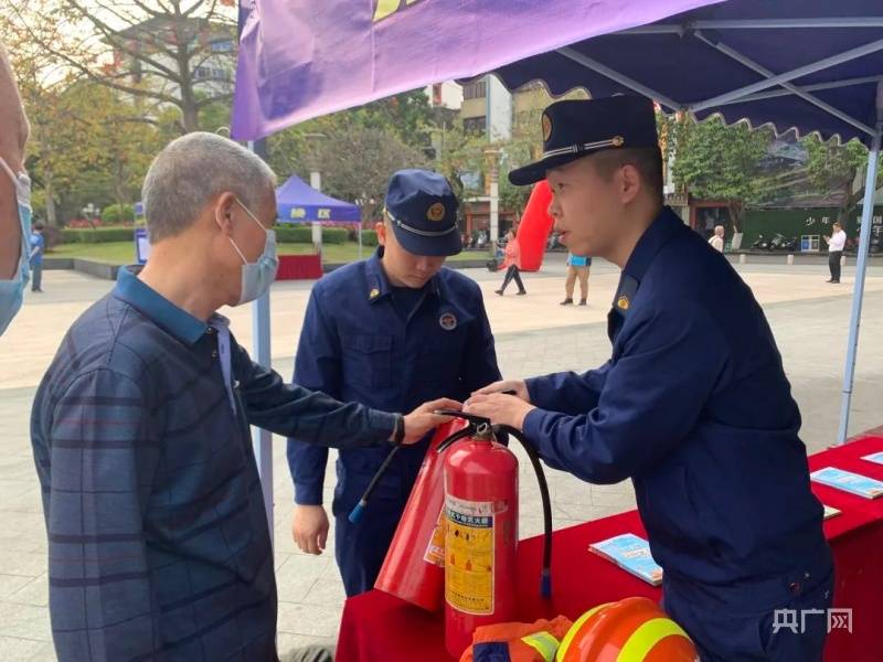 活动中,新会区消防救援大队宣讲员向群众耐心讲解各类消防安全知识,解答群众疑问,并现场展示灭火器、逃生绳结等工具的使用方法。