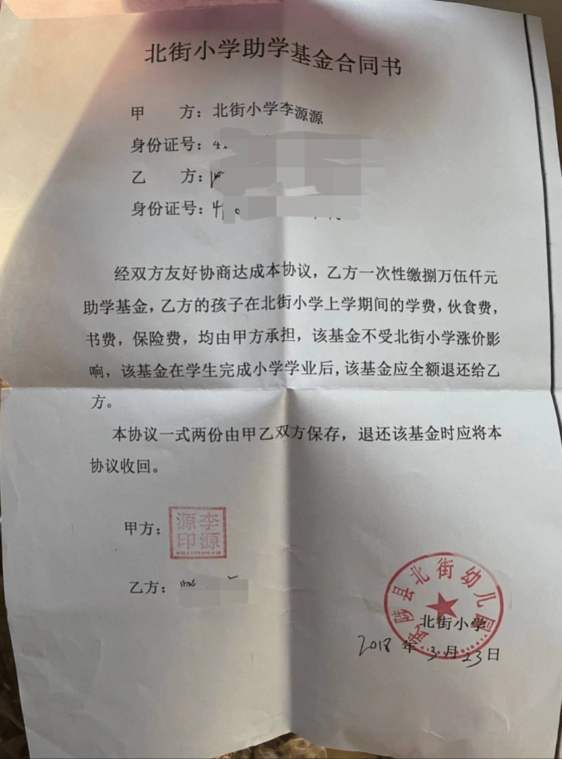 李女士所说的助学基金,是在孩子最初入学时与北街小学负责人李源源的约定:“当时他说学校还需要扩建,我们一次性给十万多的助学基金,里面包含了整个小学期间的学费、伙食费、住宿费等等,到孩子六年级毕业的时候就全额退给我们,如果中途转校,就在当年招生季时全额退回,等于上这个学就不用钱。”