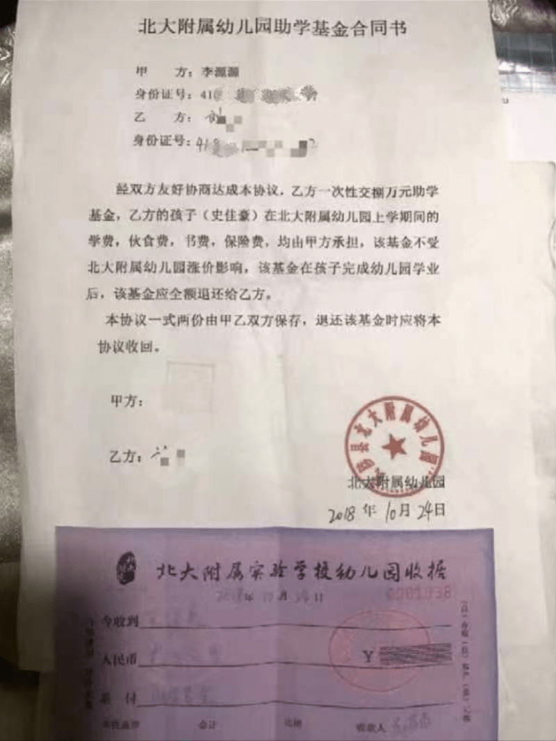多位学生家长向南都记者表示遇到同样的情况,有家长展示了家长交流群中统计的信息,向“北街小学”“北街幼儿园”“北大附属幼儿园”缴纳了助学基金的家长超过300位,缴纳金额多数在10万元左右,总金额达上千万元,有的以签订助学基金合同的形式约定,有的则以李源源为借款人立下借据。