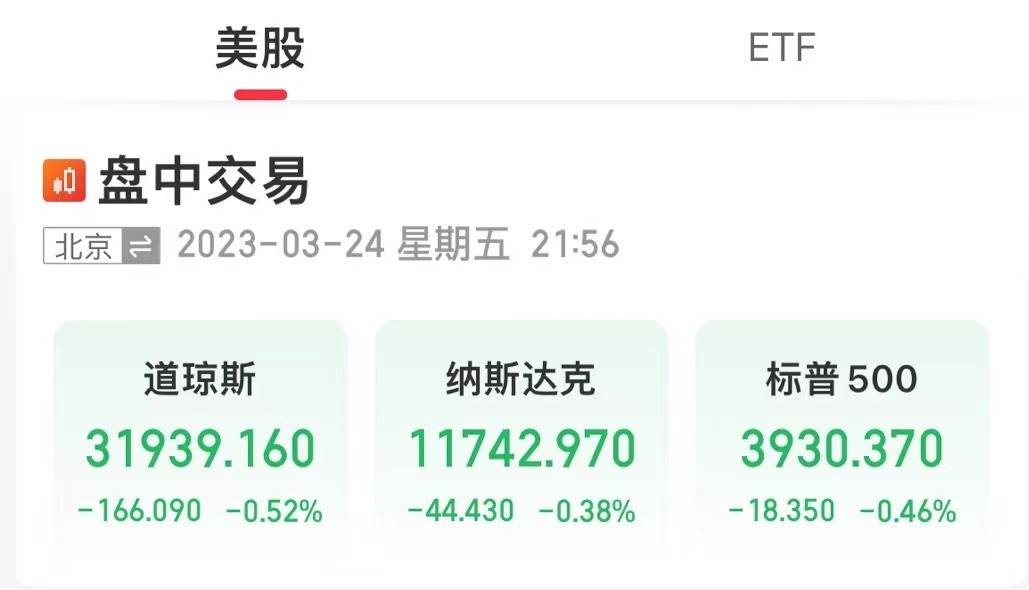 北京时间3月24日晚,美股三大指数集体低开低走,截至发稿前,道指跌0.52%,纳指跌0.38%,标普500指数跌0.46%。