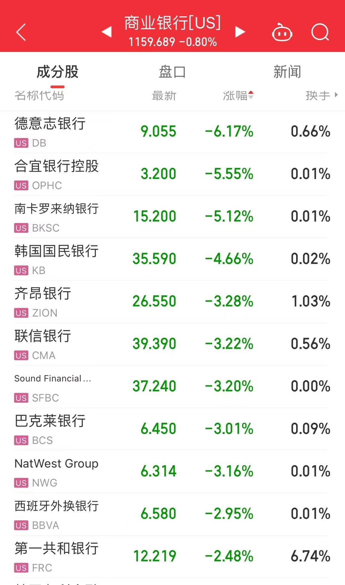 美股银行股走低,德意志银行跌超6%,瑞士信贷跌近4%,第一共和银行、瑞银跌超2%。标普500银行指数跌2%,触及2020年11月以来最低水平。
