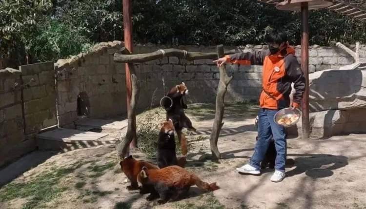 可爱的小熊猫、金头狮面狨和浣熊围着保育员讨要小零食。