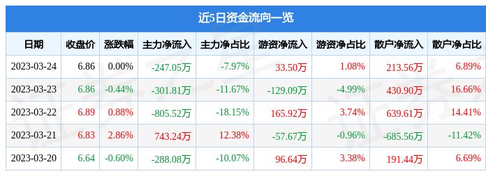 3月24日的资金流向数据方面,主力资金净流出247.05万元,占总成交额7.97%,游资资金净流入33.5万元,占总成交额1.08%,散户资金净流入213.56万元,占总成交额6.89%。
