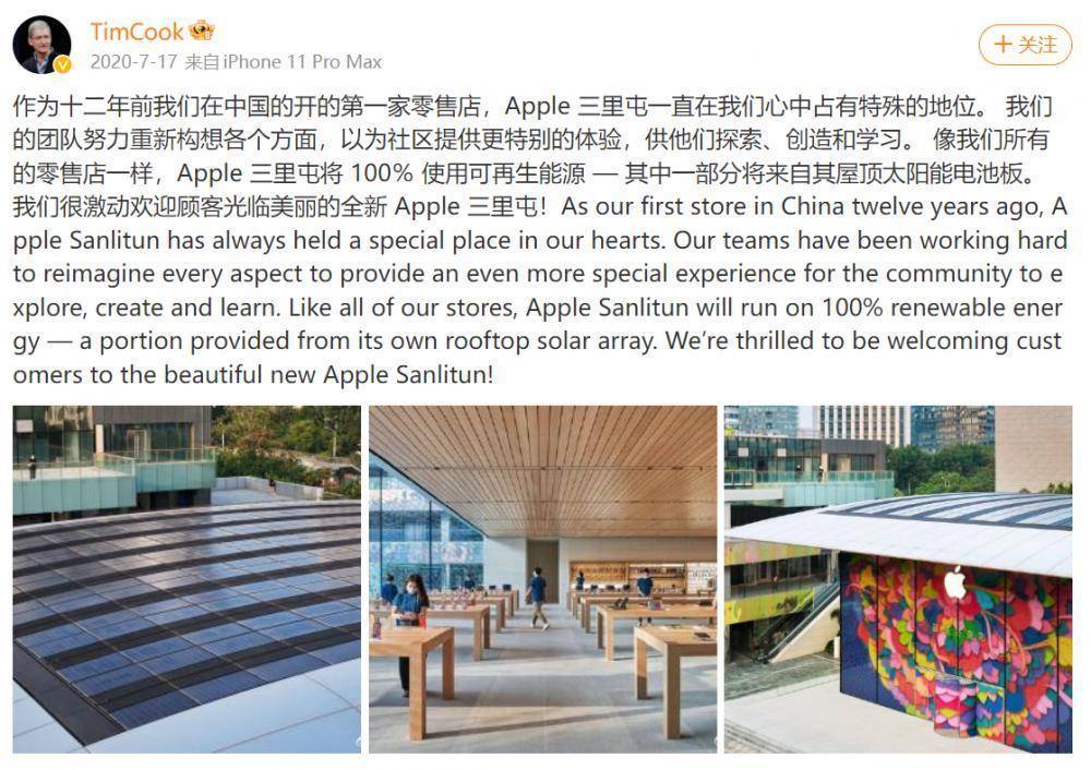 2020年库克曾在官微发文称,作为十二年前我们在中国的开的第一家零售店,Apple三里屯一直在我们心中占有特殊的地位。 我们的团队努力重新构想各个方面,以为社区提供更特别的体验,供他们探索、创造和学习。 像我们所有的零售店一样,Apple三里屯将100%使用可再生能源——其中一部分将来自其屋顶的太阳能电池板。
