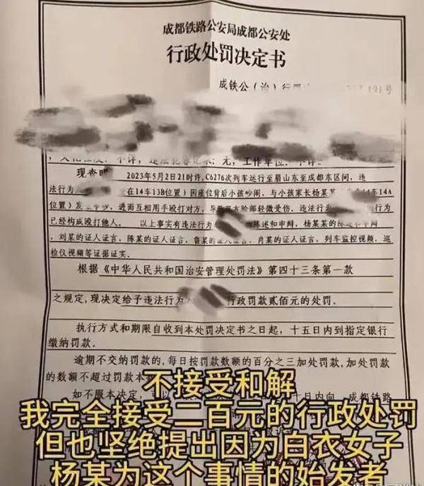 另外,该博主近日晒出的一份《成都铁路公安局成都公安处行政处罚决定书》显示,2023年5月2日21时许,C6276次列车运行至眉山东至成都东区间,违法行为人因座位背后小孩吵闹,与小孩家长杨某发生争吵,进而互相用手殴打对方,导致双方脸部轻微受伤,违法行为已经构成殴打他人,根据《治安管理处罚法》第四十三条第一款之规定,决定给予违法行为人行政罚款200元的处罚。