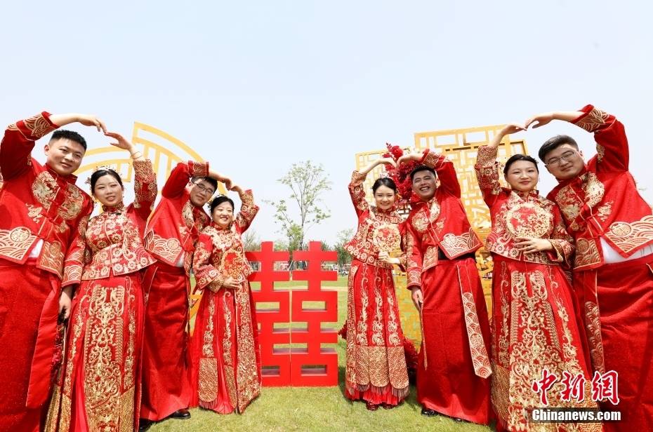 集体婚礼上,46对新人,身着火红的汉式传统婚服迎来他们的好日子。图/CNSphoto 李鑫 摄