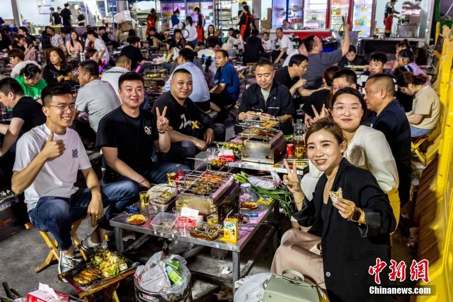食客们品尝着淄博烧烤,脸上洋溢着笑容。图/视觉中国
