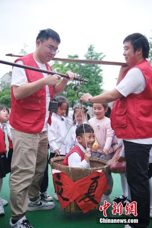 江苏省南通市,幼儿园的孩子们体验传统称体重。图/CNSphoto 徐培钦 摄