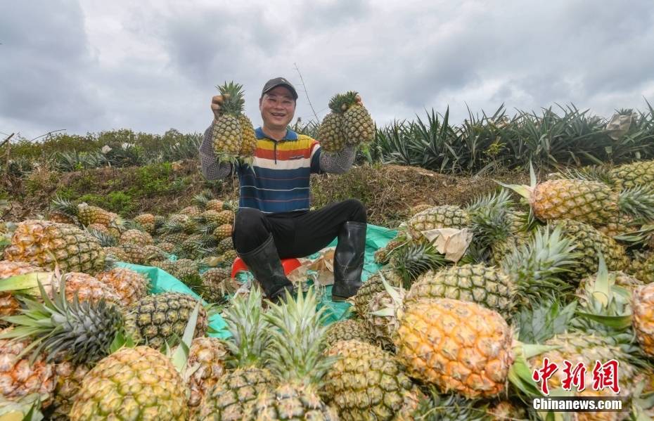 海口凤梨种植基地里,采摘工享受着凤梨丰收的喜悦。图/视觉中国
