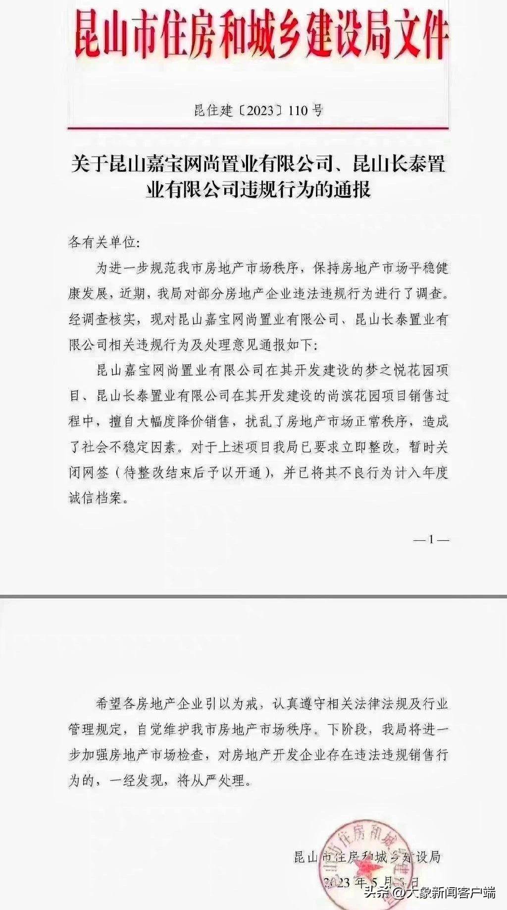 ⭐近日,苏州昆山住建局发布通报称,昆山两房企因擅自大幅度降价销售,扰乱了房地产市场正常秩序,造成了社会不稳定因素。对于上述项目暂时关闭网签,待整改结束后予以开通。