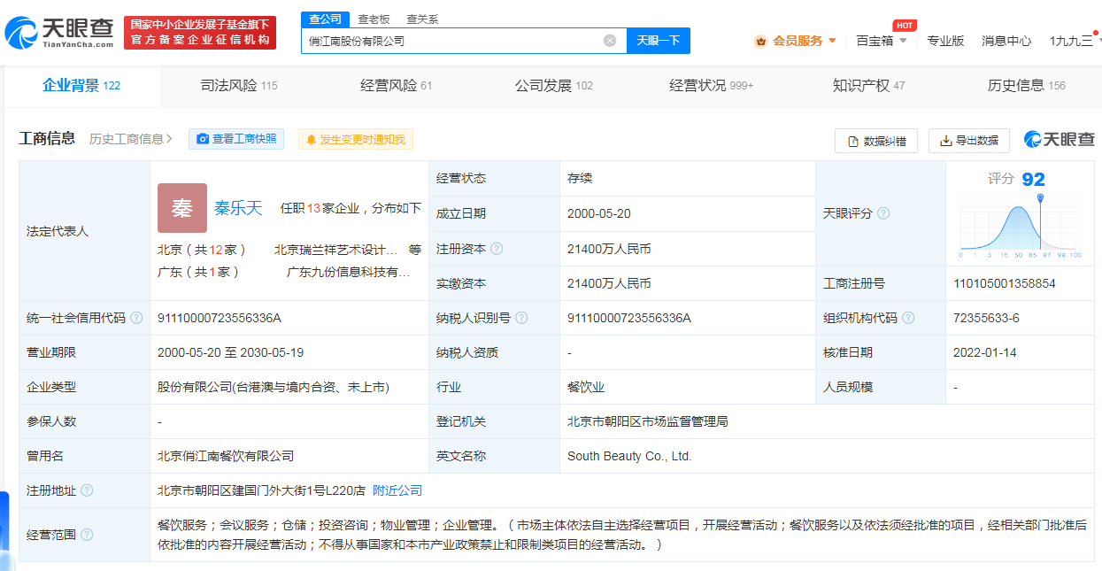 该公司成立于2000年5月,法定代表人为秦乐天,注册资本2.14亿人民币,由北京俏江南投资控股有限责任公司、金润实业投资有限公司等共同持股。