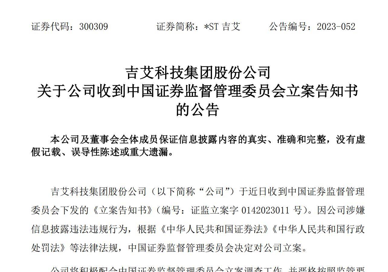 2023年5月5日,吉艾科技集团股份公司(简称ST吉艾或者公司)公告称,近日收到中国证券监督管理委员会下发的《立案告知书》。