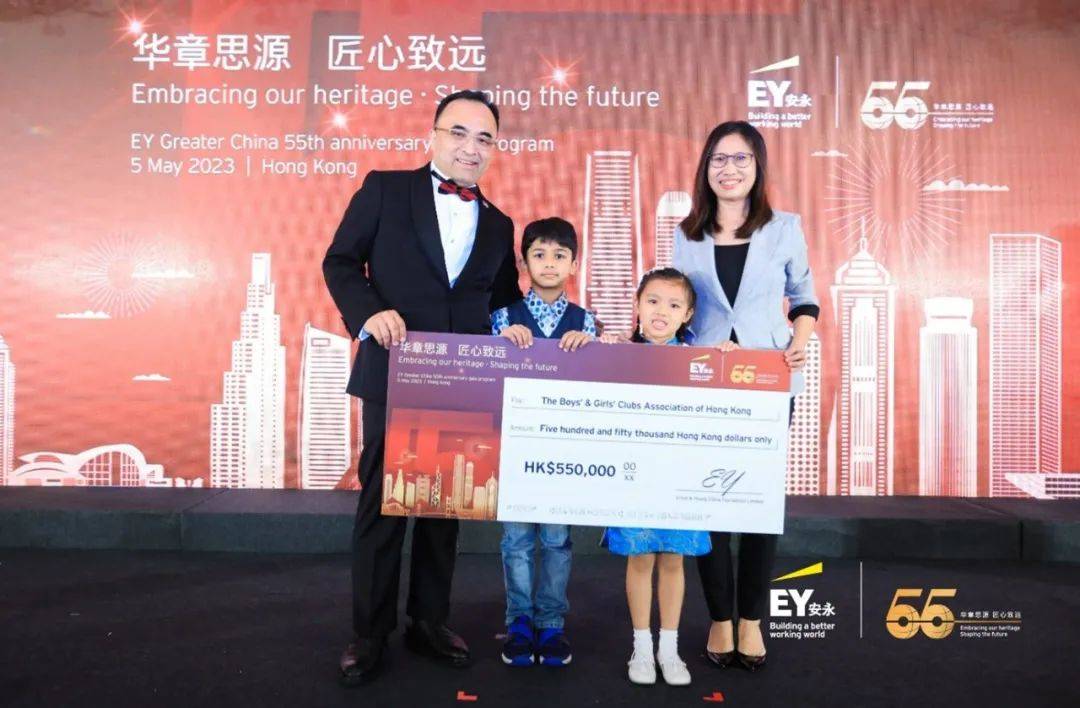 于安永大中华区55周年庆祝晚宴,安永宣布透过安永中国慈善基金有限公司,向香港小童群益会“群益宝库”捐出慈善捐款港币55万元,以支援弱势儿童及青少年,让他们获得均衡发展及发挥潜质才能的机会,为他们创造愉快、健康和丰盛的成长历程。