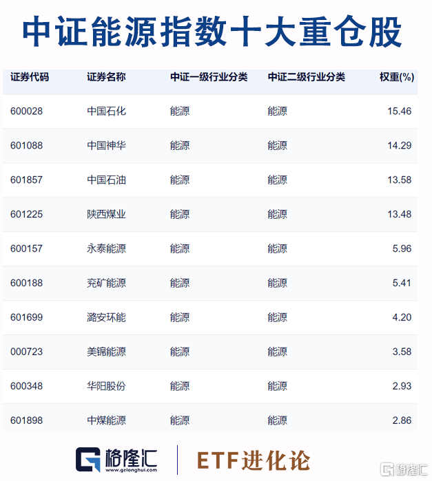 其中中证全指能源指数有50只成分股,前十大成分股分别是中国神华、中国石化、中国石油、陕西煤业等,合计权重之和高达64%,覆盖石油逾天然气、煤炭、油气开采等能源细分行业。目前跟涨该指数的基金产品只有一只——广发能源ETF基金。