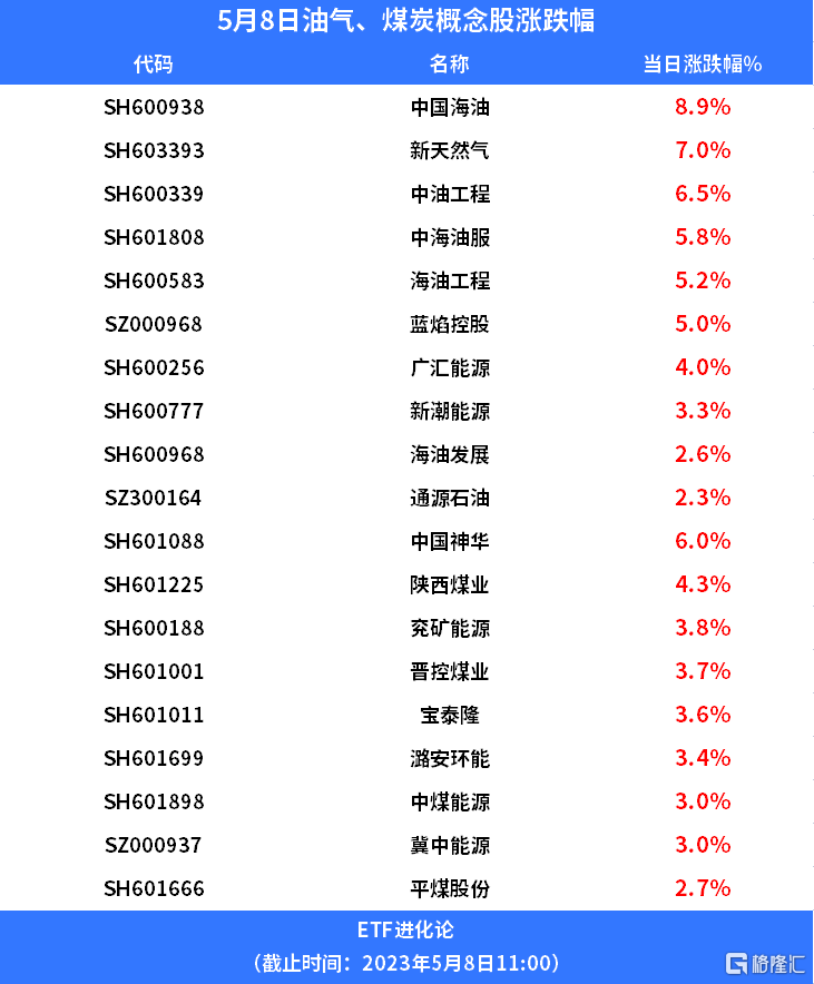 A股方面,今日能源板块开盘走强,油气、煤炭、有色金属股共振上扬,中国海油涨近9%,新天然气涨7%,中油工程涨超6%。煤炭股中,中国神华涨6%,陕西煤业涨4%。