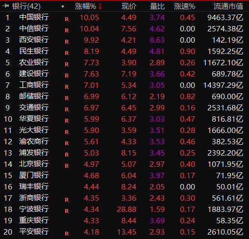 就在刚才,中信银行、中国银行、西安银行强势涨停,工商银行、农业银行涨幅皆超7%。而这已经不是近期银行股第一次“暴动”了。受银行股带动,整个中字头板块亦表现十分出色,上证指数更是上涨近50个点。在A股历史上,这种行情是极为罕见的。那么,究竟发生了什么?