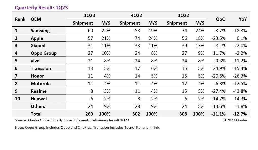 OPPO在2023年第一季度的出货量为2700万,vivo为2100万。因此,小米对OPPO集团的领先优势缩小,已从2022年第一季度的1200万下降到2023年第一季度仅400万。小米的市场份额也从13%下降到11%,而OPPO的市场份额从9%上升到10%。