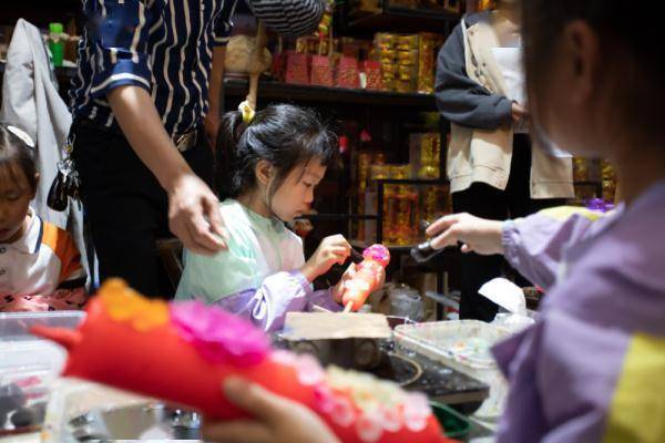 走进集市,传统糖人制作、龙凤花烛制作体验等非遗、民俗项目颇受市民、游客青睐。市民严丽说:“今天我带孩子来这里学习体验了龙凤花烛制作过程,我看她很认真,准备买一点原料,让她在家也可以学习。”
